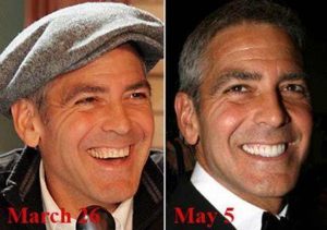 George Clooney tem alguns dentes com faceta de porcelana. Supostamente, a estrela range os dentes, e é por isso que ele precisou recorrer a um dentista.