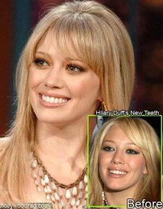 Há rumores de que Hilary Duff lascou o dente em um microfone e optou por fazer uma faceta em todos os dentes, ao invés de só mexer no dente lascado.
