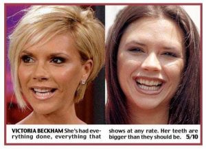 Evidências fotográficas sugerem que o sorriso perfeito de Victoria Beckham é composto de dentes com faceta de porcelana.