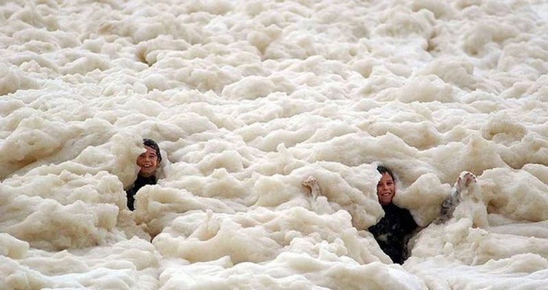 Quando há uma anomalia nos microorganismos do mar, é possível que se crie um volume maior de espuma, gerando um efeito capuccino. A espuma tem uma tonalidade marrom devido à sujeira, restos de peixe e algas. A última vez que isso aconteceu foi na costa do País de Gales. Apesar da aparência fofa, as espumas carregam muita sujeira e podem cheirar mal.