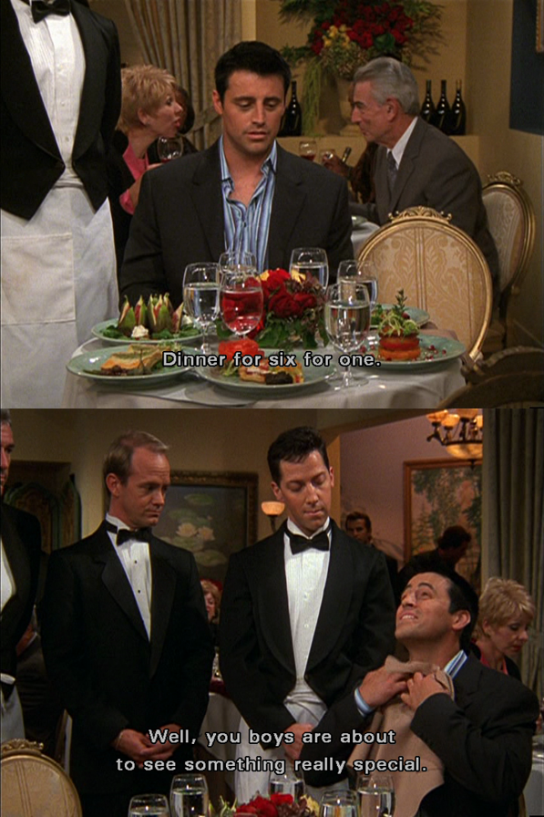 Joey Tribbiani, o mais galante dos seis amigos, foi interpretado pelo ator Matt LeBlanc. Mas o personagem também ficou famoso pelo seu comportamento glutão em relação à comida.