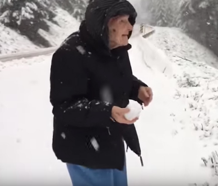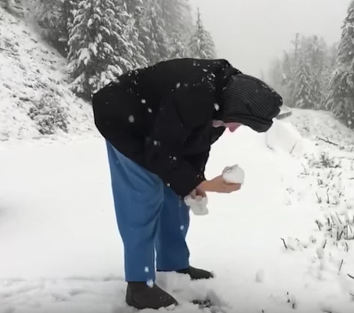 À medida que os flocos de neve atingiam o chão, parecia que sua mãe voltava para seu eu mais novo quando era cheia de vida. Ela esmagou o gelo em uma bola e atirou-a como uma criança. Embora essa senhora tenha bastante idade, ela é jovem de coração e provou que idade é apenas um número.