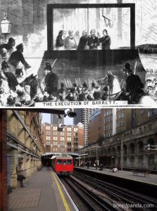Micheal Barrett foi o último a ser executado dessa maneira, na prisão de Newgate, em Londres, na frente de uma grande multidão de pessoas. 5 anos antes, em 1863, a primeira jornada do metrô de Londres ocorreu. Com uma estação em operação perto da prisão de Newgate, era possível que muitos londrinos pegassem o metrô para assistir a alguém sendo enforcado.