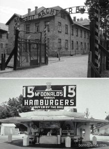 Enquanto o McDonald’s é tradicionalmente associado aos bons tempos e a afluência da América de 1950, o primeiro restaurante foi aberto muito antes, em 15 de maio de 1940. Apenas cinco dias depois, os primeiros prisioneiros chegaram ao campo de concentração de Auschwitz, onde hoje é a Polônia.