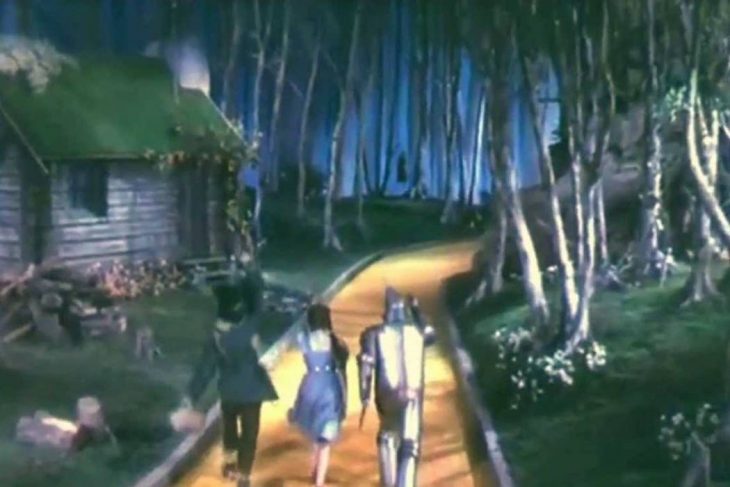 Aunque parezca el escenario más feliz e inocente del mundo, si miras de cerca puedes observar que el camino de los protagonistas en dirección a la Tierra de Oz termina en un sombrío bosque con una persona colgando de un árbol.