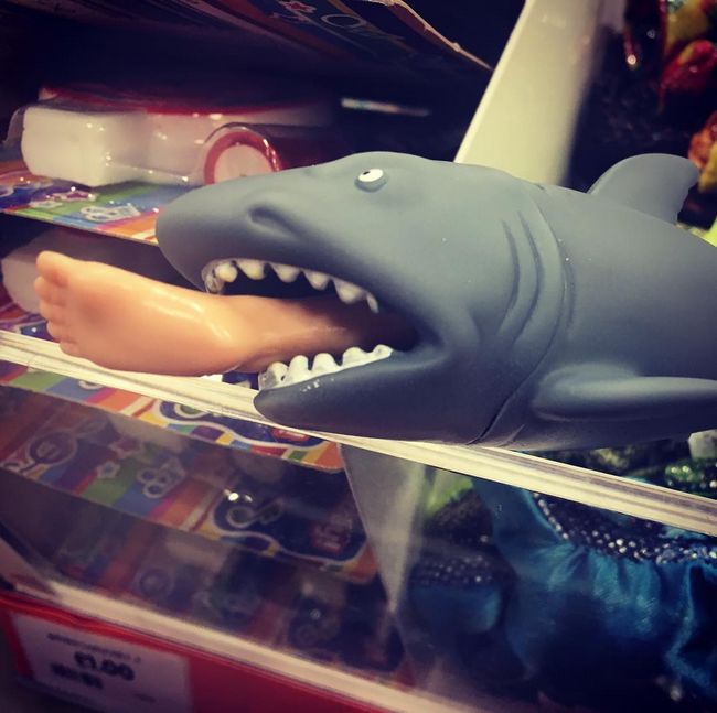 13 – Um tubarão comendo uma perna realmente é um ótimo brinquedo. Só que não!