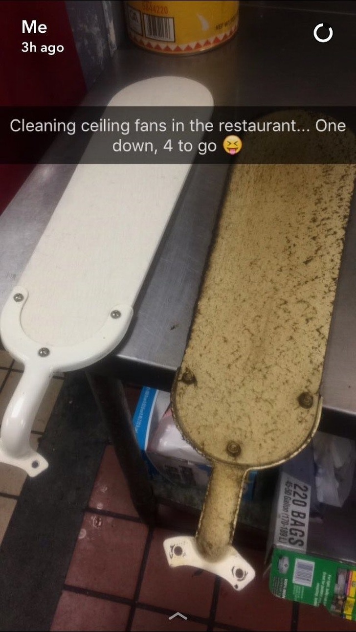 “Limpiando los ventiladores de techo en el restaurante. Uno listo, faltan otros cuatro”.