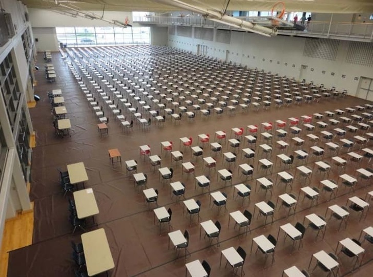 10. Escritorios de una escuela que han sido perfectamente alineados antes de un examen