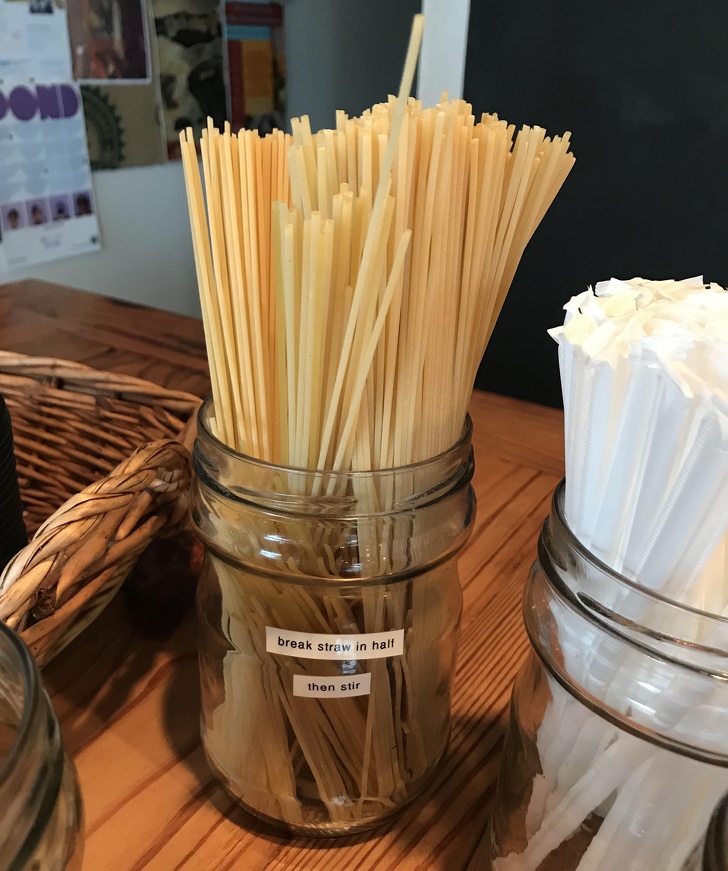 9. En una cafetería, ofrecen pasta en lugar de las pajillas de plástico habituales. El frasco dice: “Rompe la pasta al medio y luego revuelve tu bebida”.
