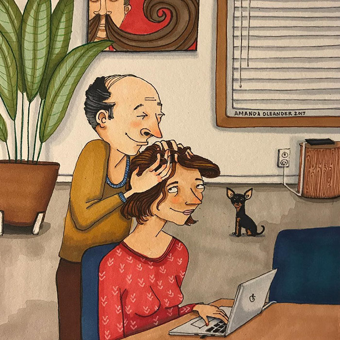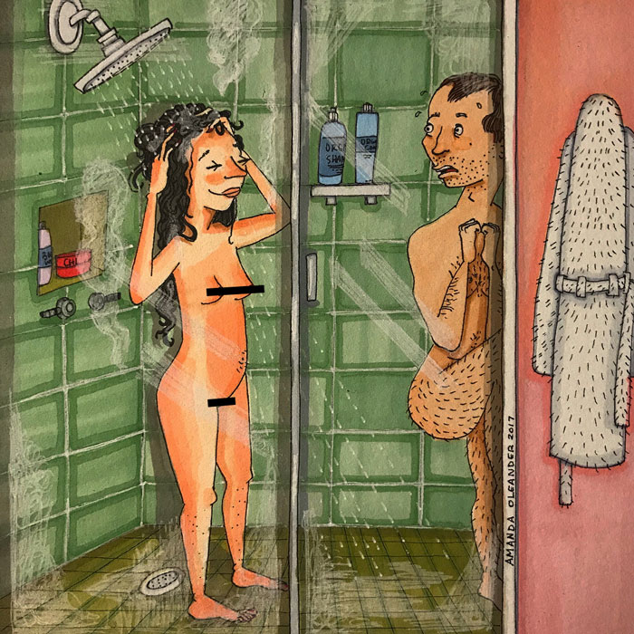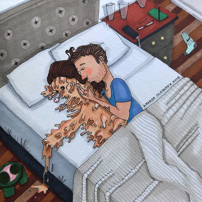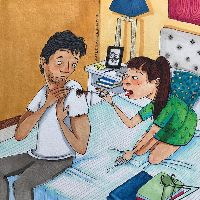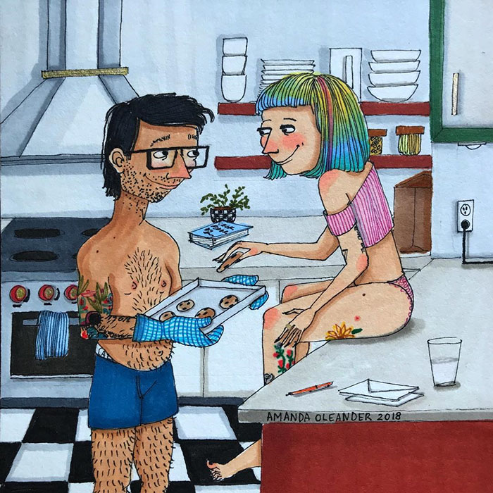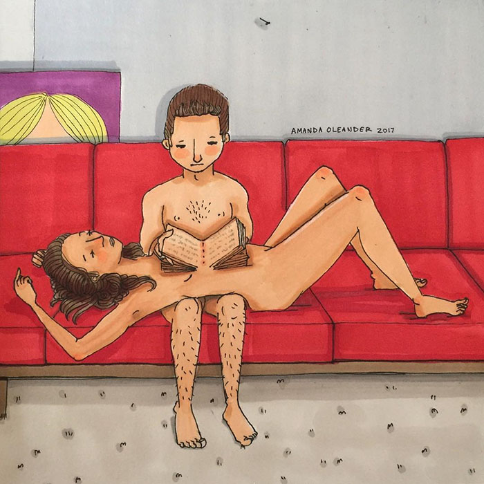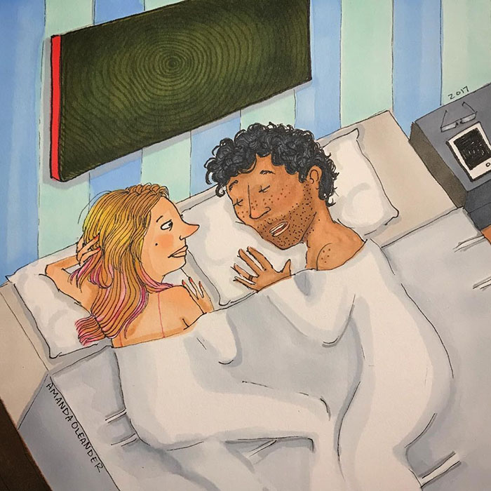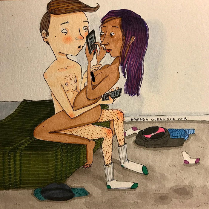 Uma artista talentosíssima chamada Amanda Oleander soube traduzir o universo dos relacionamentos em ilustrações divertidas, inspiradas em sua própria experiência de relacionamento com o ator Joey Rudman. Nessas imagens, ela mostra como é a intimidade dos casais reais (e não aqueles de Instagram).