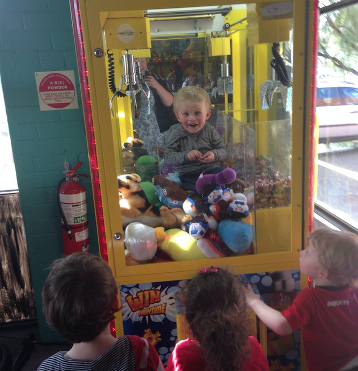 “Esse bebê ficou preso na máquina de brinquedos, e enquanto esperava para ser retirado, ficou jogando balas e bonecos para os amigos”