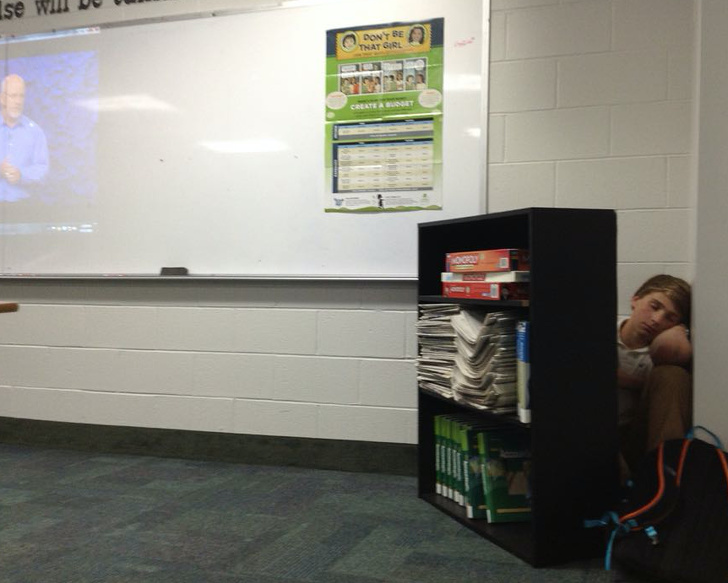 “Ele se escondeu atrás de um pequeno móvel e adormeceu na aula durante a exibição de um vídeo”