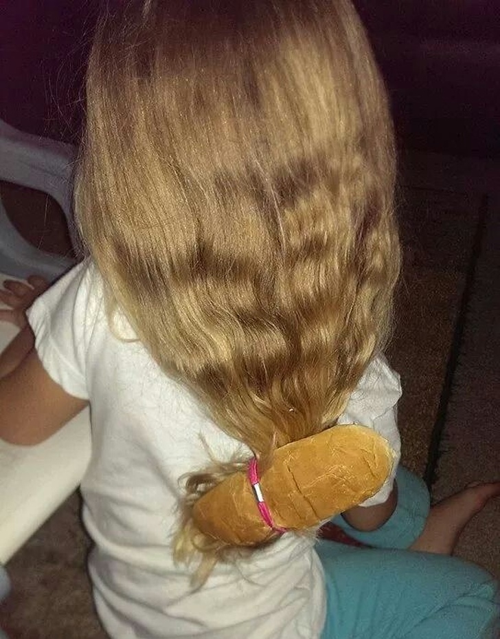 9. Esta garota pediu ao papai que arrumasse o cabelo da melhor forma possível. Ele só tinha uma baguete e assim foi
