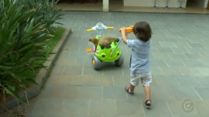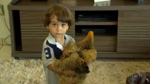 O rapazinho tem apenas dois anos de idade e mora em Mirassol, em São Paulo. Faz uns seis meses desde que ele ganhou de sua vó um pintinho, que cresceu e agora é uma galinha chamada Tatá.