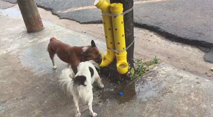 Os dispositivos foram construídos com canos de PVC e são reabastecidos com ração e água fresca pela própria comerciante, que se compromete com sua compaixão pelos bichinhos abandonados.