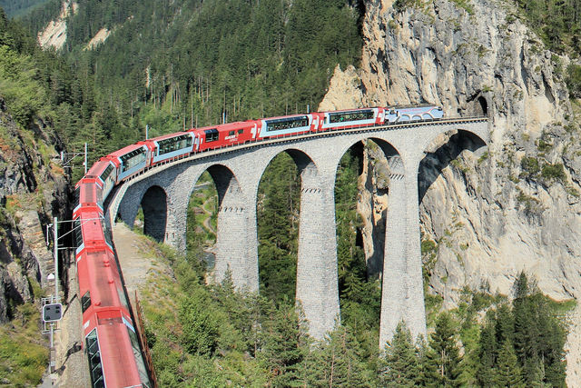 Esta ponte é uma maravilha arquitetônica. Você pode ver seis arcos de calcário descansando em cinco pilares altos. A ponte leva diretamente para o túnel Landwasser, na Suíça, de 216 metros de comprimento.