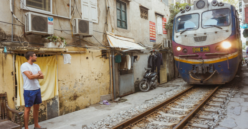 O trem em Hanoi, no Vietnã, passa por um beco muito estreito, no qual conta com casas em ambos os lados.