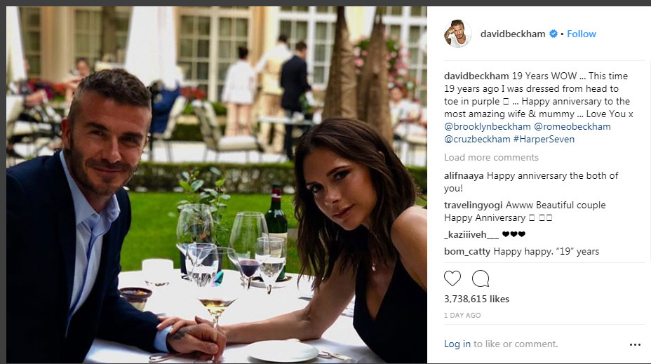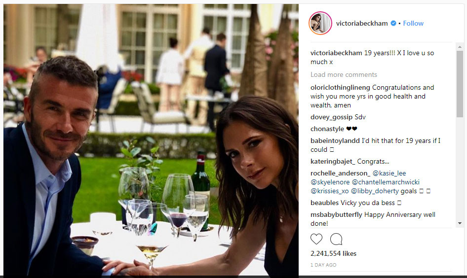 A estilista de 44 anos Victoria Beckham postou a mesma foto, escrevendo simplesmente: “19 anos !!! X eu te amo tanto x ”.