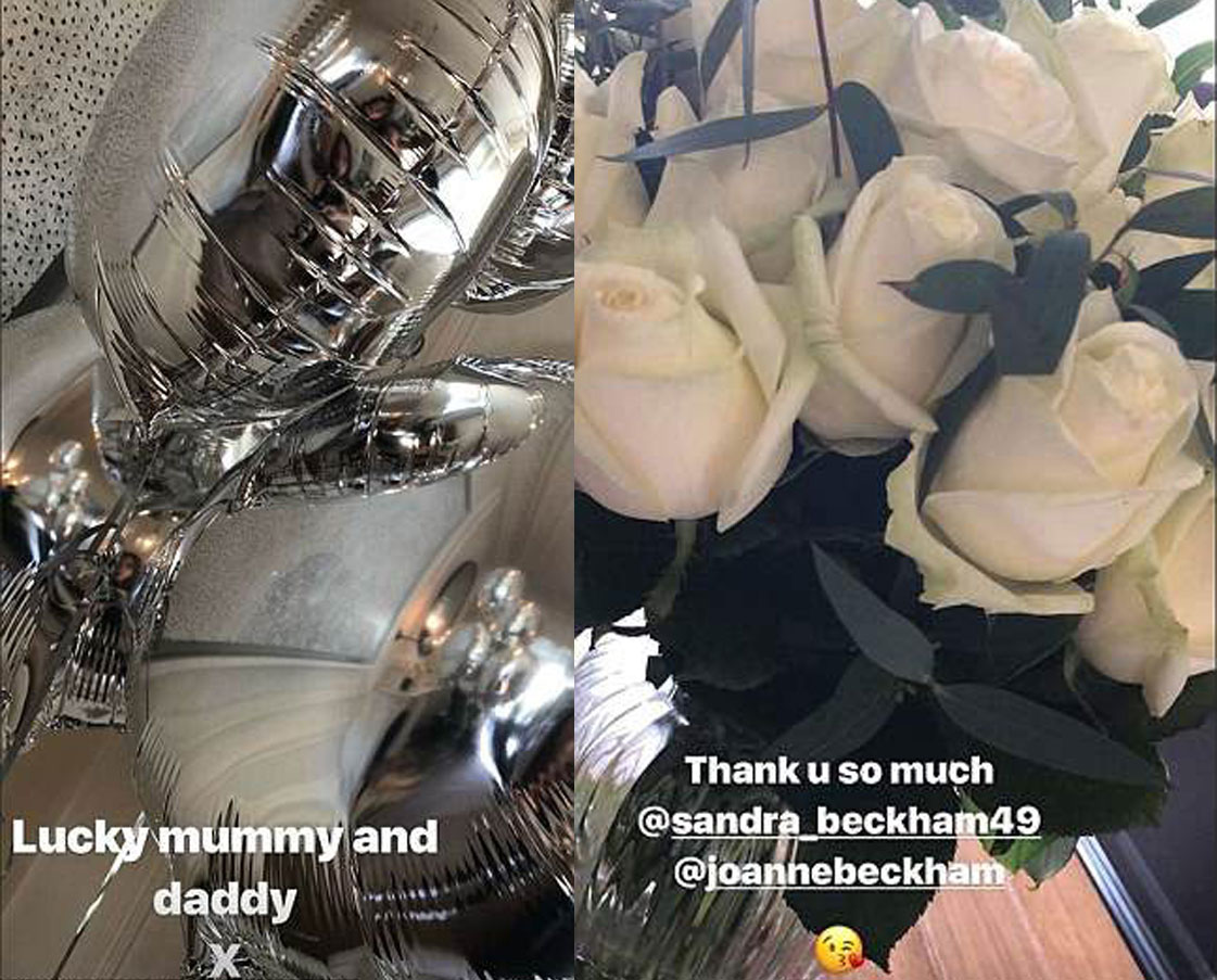 Ela também compartilhou algumas fotos de seus presentes de aniversário de casamento, com alguns balões prateados das crianças e flores de Sandra e Joanne Beckham.
