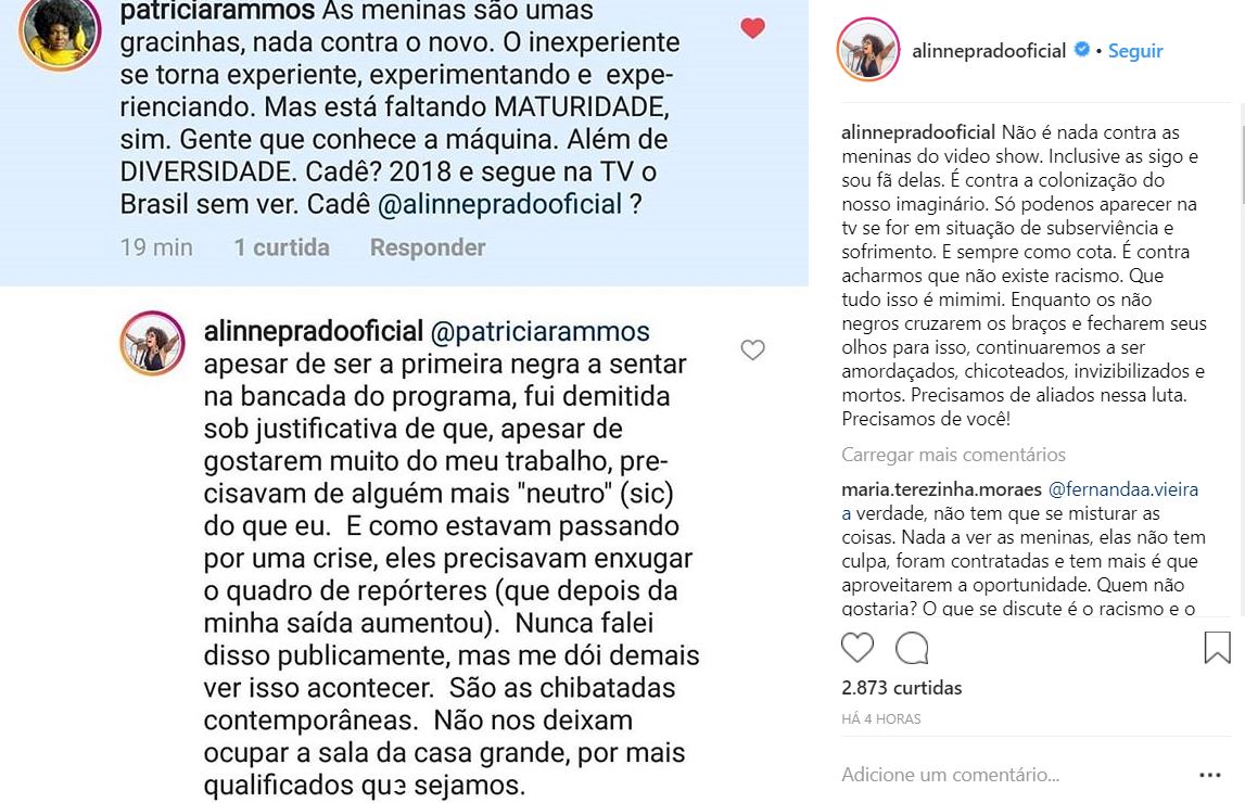 Logo após a estreia do novo formato, a jornalista Alinne Prado, que foi repórter da atração por cerca de dois anos, foi questionada por uma seguidora sobre a falta de experiência e de representatividade das novas apresentadoras.