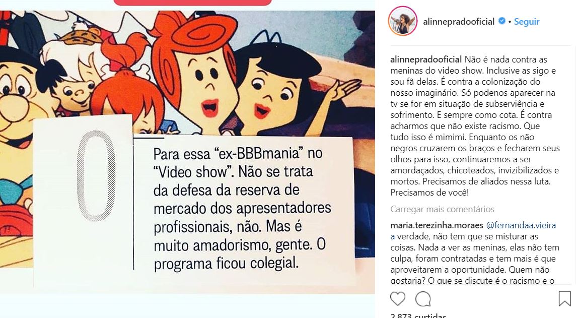 Depois do desabafo, Alinne também postou uma imagem que diz que o programa ficou “colegial”. “Para essa ‘ex-BBB mania’ no Vídeo Show. Não se trata da defesa da reserva de mercado dos apresentadores profissionais, não. Mas é muito amadorismo, gente. O programa ficou colegial”. A jornalista fez parte do programa de 2015 a 2017.