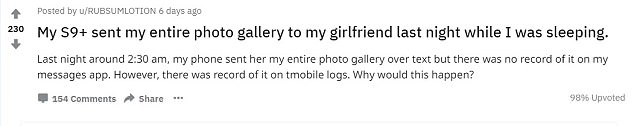 “Meu S9 + enviou minha galeria de fotos inteira para a minha namorada na noite passada enquanto eu estava dormindo”, escreveu o homem no Reddit. “Na noite passada, por volta das duas e meia da manhã, meu telefone enviou a ela toda a minha galeria de fotos por mensagem, mas não havia registro dele em meu aplicativo de mensagens. No entanto, houve registro dele nos logs do TMobile. Por que isso aconteceria?”