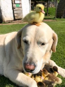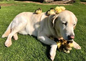 O labrador decidiu encarar a difícil missão de cuidar de 9 bebês – de outra raça! Sendo muito paciente e carinhoso, Fred deixa que os pequenos patinhos subam em suas costas, em sua cabeça, e se aninhem ao seu lado. Embora já seja um senhorzinho – o labrador já tem 10 anos – ele não se abala com a energia de seus novos filhos.