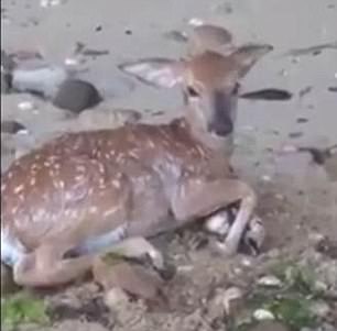 O homem chamou imediatamente o resgate de animais, mas infelizmente, quando os especialistas chegaram, o cervo ficou assustado e correu de volta para a água. Agora eles eram os responsáveis por salvar a vida desse animal.