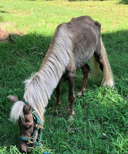 Sammy, o cavalo, foi originalmente encontrado por um abrigo da Carolina do Sul, que pesava apenas 90 kg, segundo o News and Observer.