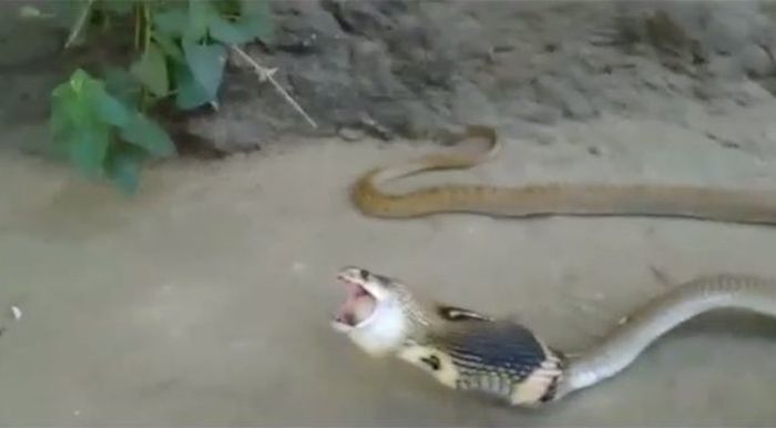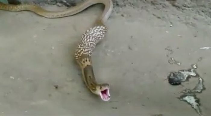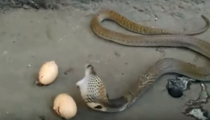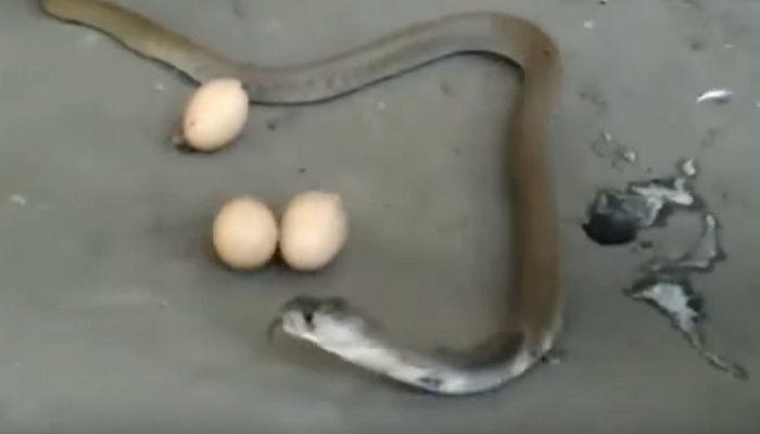 O caçador instantaneamente assumiu o controle, empurrando a cobra com um bastão. Ameaçada, a cobra começou a cuspir os ovos.