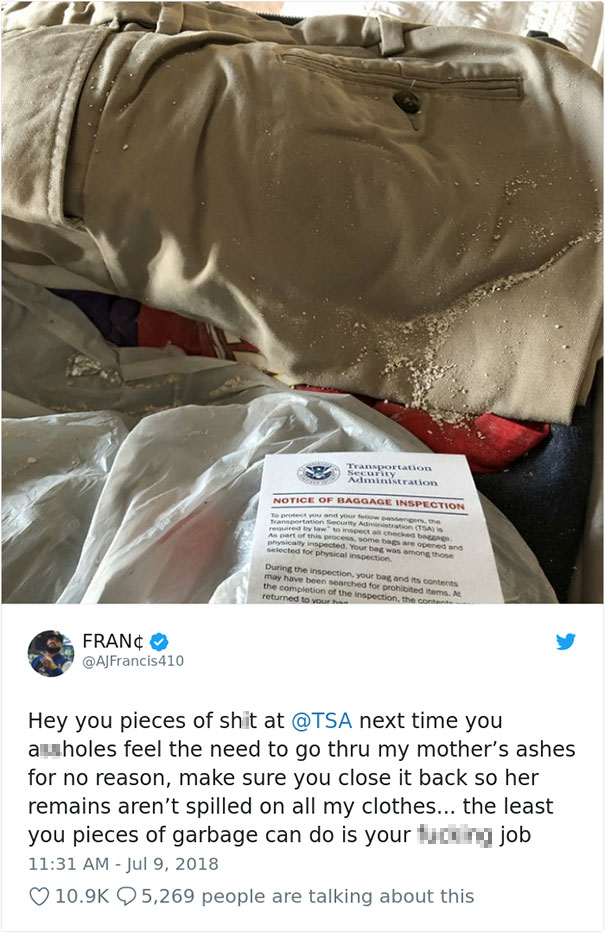 3. ”Ei, seus pedaços de m* da Administração Pública de Transporte, da próxima vez que vocês imbecis sentirem necessidade de mexerem nas cinzas da minha mãe sem razão aparente, se certifiquem de fechar a urna, assim os restos dela não se espalham nas minhas roupas… o mínimo que vocês, seus restos de lixo, devem fazer é o trabalho de vocês”