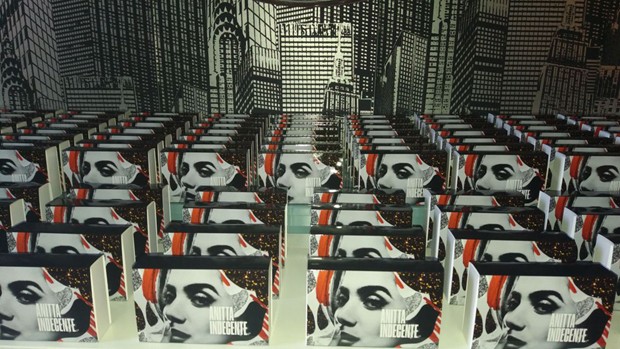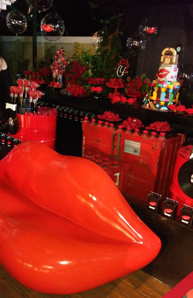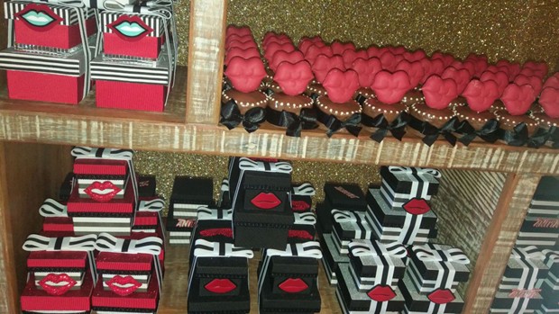 A cantora também presenteou os convidados com lembrancinhas. Para as mulheres, foi dada uma necessaire em formato de boca vermelha com glitter e um home spray. E para os homens, uma seleção de balas e chicletes.