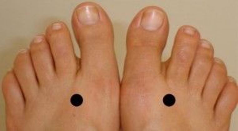 Logo acima desses pontos pretos do seu segundo dedo do pé e do dedão do pé, aplique pressão por um minuto para ajudar nos problemas relacionados ao abdômen inferior.