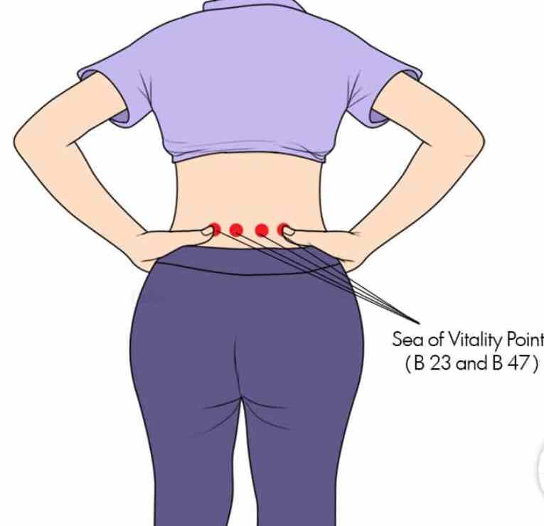 O Mar da Vitalidade está localizado na sua cintura, a quatro dedos da espinha. Aplique pressão suficiente a esses pontos para rejuvenescer seus órgãos internos e fortalecer seu sistema imunológico. Este método também aliviará a dor e a indigestão do estômago.