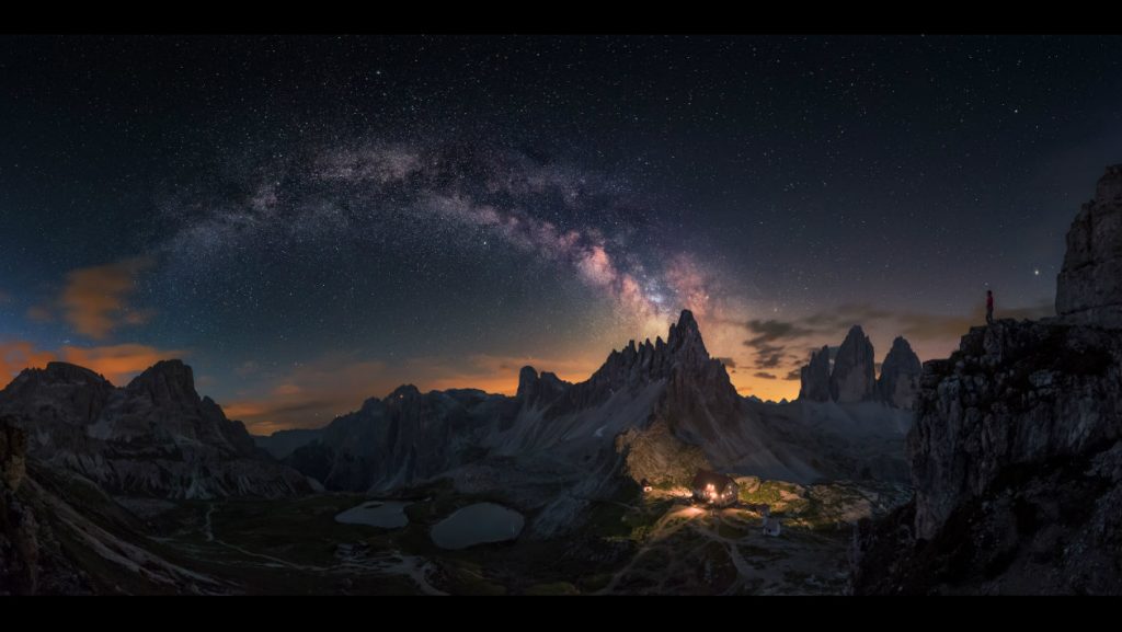 Essa imagem é, na verdade, uma composição de oito fotos. Ela mostra o surgimento da Via Láctea sobre as Dolomitas em Tre Cime.