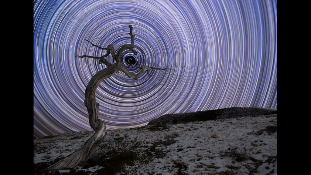 Nessa captura fotográfica de longa exposição, estrelas arqueadas giram em torno de Polares, a estrela mais brilhante da constelação de Ursa Menor. Também se pode observar na foto um zimbro intemperizado cresce nas Montanhas Rochosas de Montana, EUA.