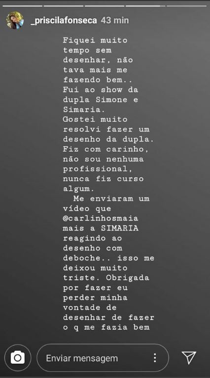 Em uma postagem no Instagram Stories, Priscilla desabafou sobre o caso. “Fiquei muito tempo sem desenhar, mas não estava mais me fazendo bem. Fui ao show da dupla Simone e Simaria. Gostei muito e resolvi fazer um desenho. Fiz com carinho. Não sou nenhuma profissional, nunca fiz curso. Me enviaram o vídeo do Carlinhos e a Simaria reagindo ao desenho com deboche. Isso me deixou muito triste. Obrigada por fazer eu perder minha vontade de desenhar”, disse ela.