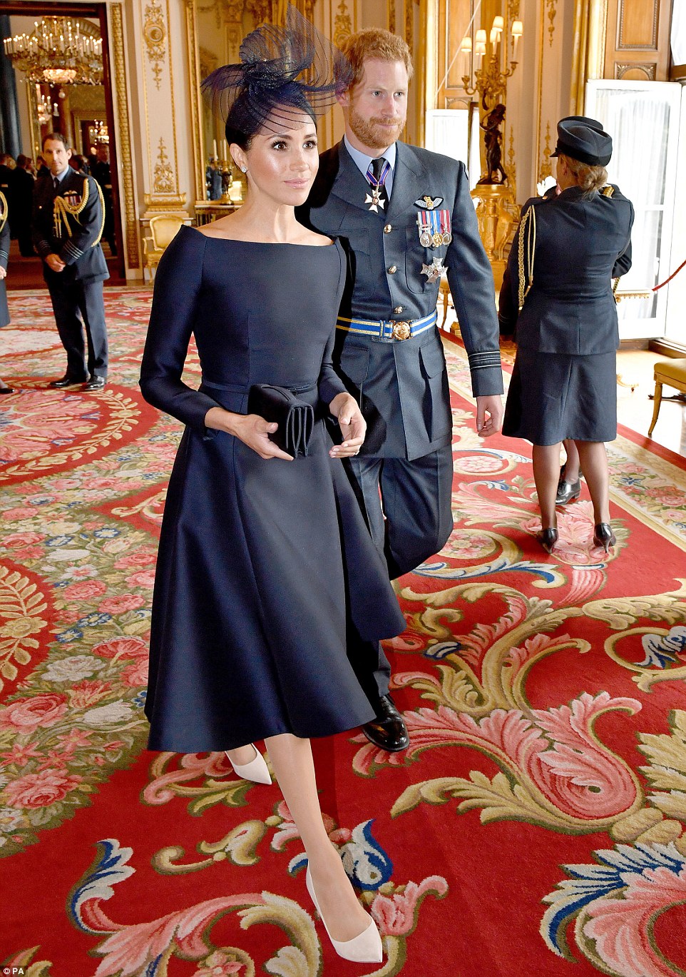 Meghan usava um vestido preto de corte reto e saia flare emparelhado com uma bolsa preta e sapatos nude. Ela completou seu look com brincos de prata e um chapéu preto.