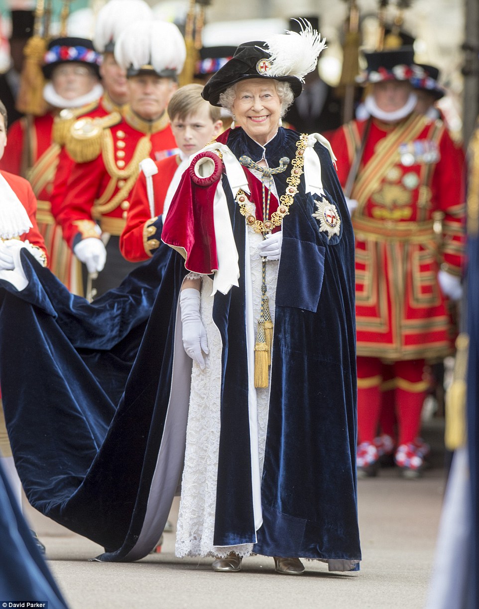 A rainha foi acompanhada pelo príncipe Charles, o príncipe William e a duquesa da Cornualha, Camilla, enquanto conduzia as celebrações no serviço anual do Garter Day no Castelo de Windsor. Sua Majestade chegou em sua limusine real.