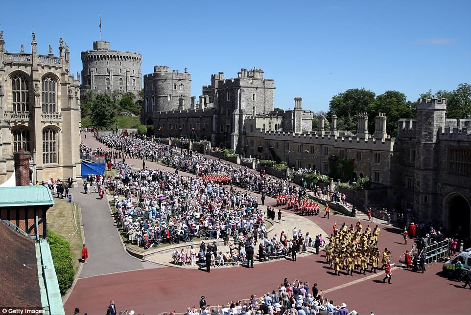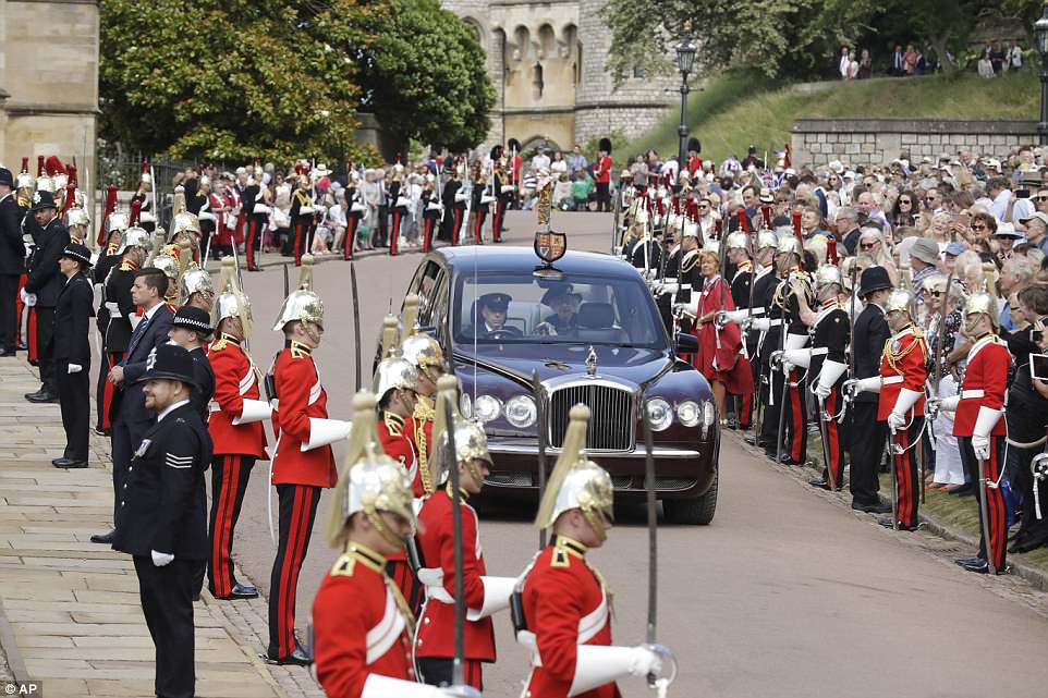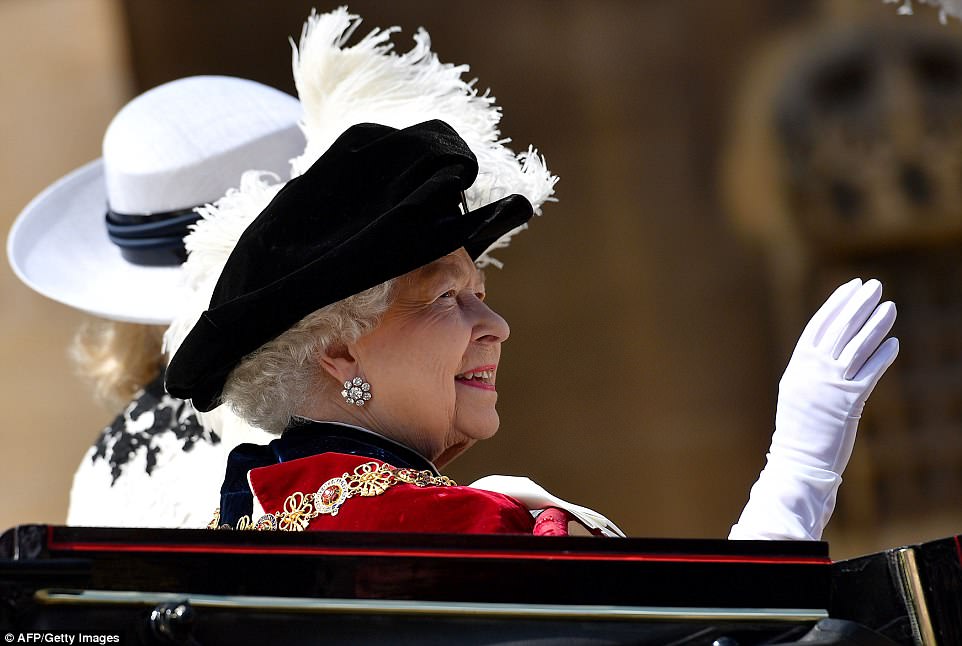 A rainha chegou à capela usando o tradicional manto de veludo e um chapéu de plumas. Ela acenou para a multidão do lado de fora do Castelo de Windsor, e a multidão aplaudiu em cumprimento à rainha.