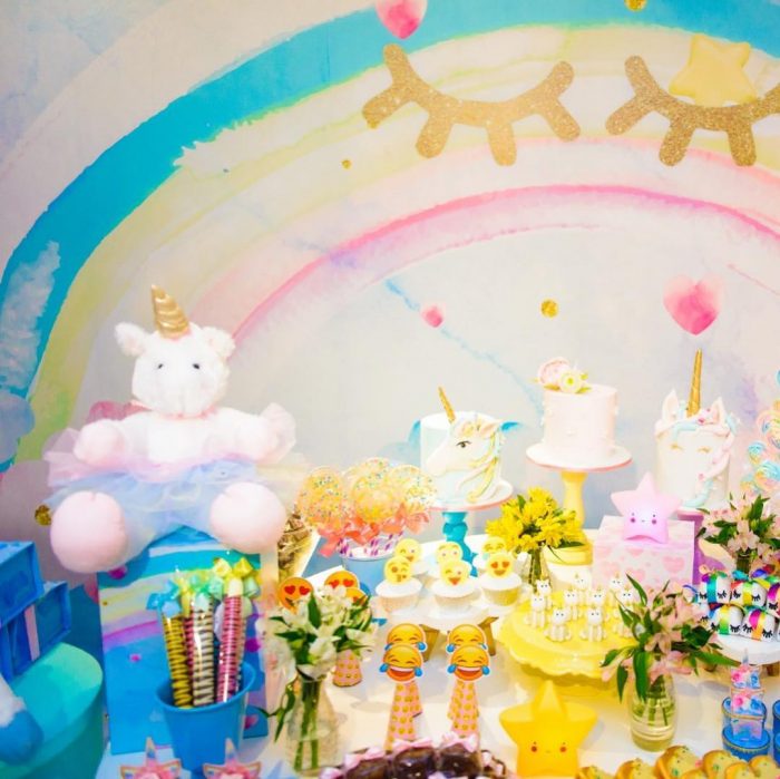Para a festança, as meninas escolherem um tema que está muito na moda: Unicórnios! Nem precisa falar que a decoração ficou um verdadeiro sonho.