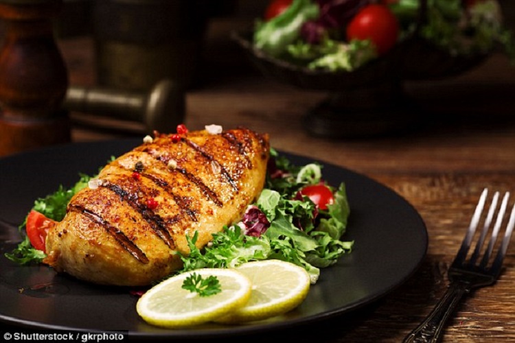 A ingestão de proteínas vem de frango grelhado, peixe grelhado ou steak.