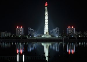 A Torre da Ideia Juche, um dos objetos mais iluminados da nação, em Pyongyang