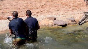 No vídeo, é possível ver o bebê já dentro da água, se debatendo. A mãe, cansada do parto, vai até ele como se não soubesse o que fazer, até que os funcionários do zoológico aparecem para o resgate. Eles cuidadosamente pegam o bebê nos braços, ao mesmo tempo em que tentam afastar a mãe zelosa, já que bom, a princípio ela não sabia o que eles estavam fazendo com a pequena zebrinha.