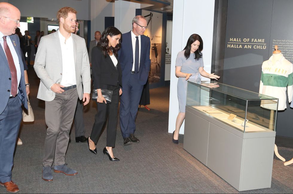 Em seguida, eles visitaram Croke Park, a sede da Associação Atlética Gaélica. Meghan parecia chique em um terninho preto e elegante.