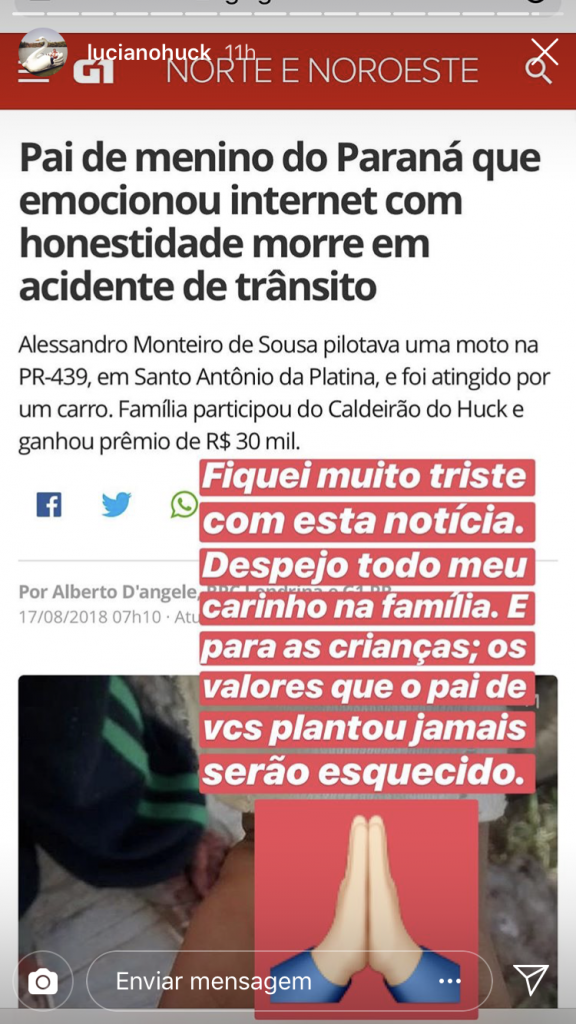Assim como o público, Luciano Huck também usou as redes sociais para lamentar a morte de Alessandro, mostrando-se muito abalado com a notícia. “Fiquei muito triste com esta notícia. Despejo todo meu carinho na família. E para as crianças, os valores que o pai de vocês plantou jamais serão esquecidos”, declarou através da ferramenta Stories.