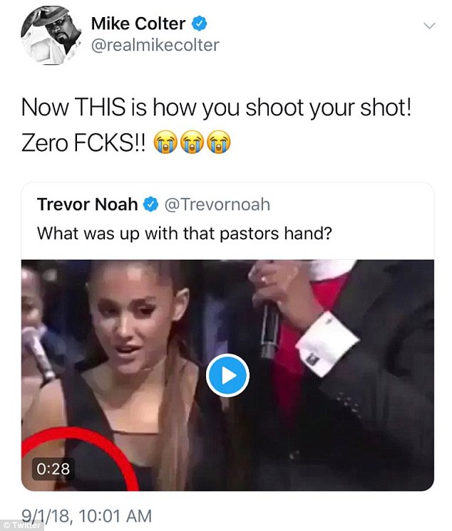 Seu tweet foi em resposta ao tweet de Trevor Noah, que incluía uma imagem de Grande aparentemente sendo apalpada.