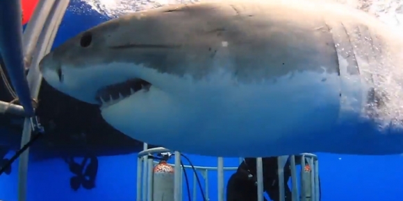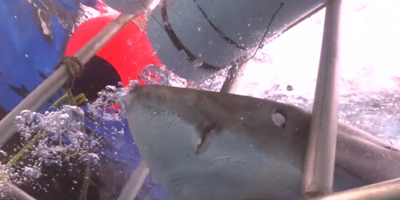 No processo, os pesquisadores estão em uma situação perigosa enquanto o tubarão empurra seu nariz pelas grades da gaiola.