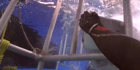 No entanto, o mergulhador na gaiola permanece calmo, toca o nariz do tubarão branco e o empurra casualmente para fora de lá, e ele desaparece na água sem causar mais problemas.
