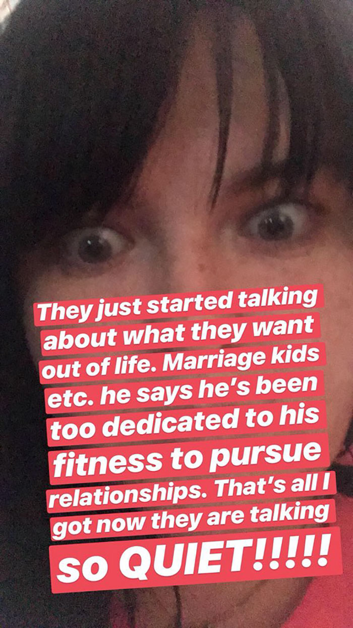 Eles acabaram de começar a falar sobre o que querem da vida deles. Casamento, filhos, etc. Ele disse que está muito dedicado à carreira fitness para buscar outros relacionamentos. Isso é tudo que eu entendi agora enquanto eles estão conversando, que silencio!!!